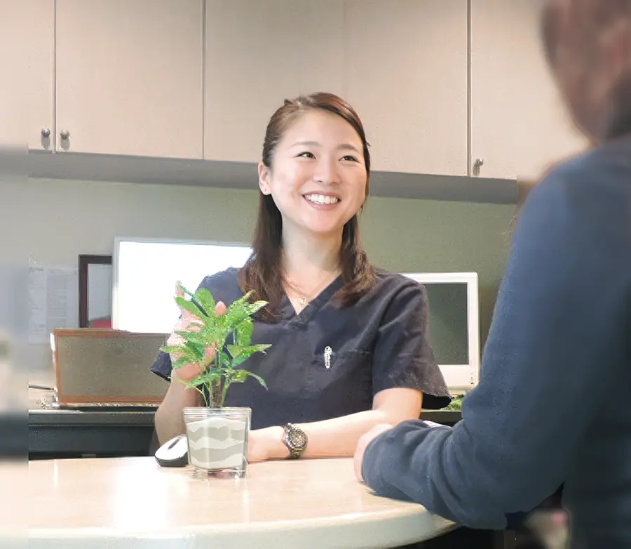 皆様に気持ちよく通っていただけるよう、入口から歯科医院を感じさせない空間づくりや、季節にあわせてリラックスできるアロマをコーディネートし、スタッフ一同笑顔でお出迎えします。お口は健康の入り口です。虫歯、歯周病、噛み合わせや食いしばりからくる体の不調などのトラブルを早く改善し、美味しく食べることができ、素敵な笑顔ができるようお手伝いができれば、と考えております。